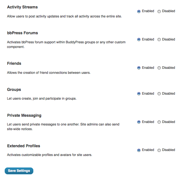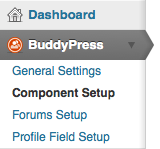 The default settings for BuddyPress offer a lot of functionality. You may not need or want a lot of the things that are possible for your network. With this in mind, the makers of BuddyPress have made it easy to disable these features. Navigate to Component Settings in the new BuddyPress section of your Dashboard.