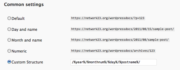 Once the Permalinks set-up is installed, you can control how links look. To do this point your browser to the Settings > Permalinks page in your dashboard.