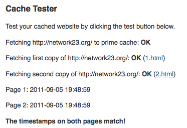 The process of testing is listed when we get the results of the test. Two copies of the front page of the site being testing are fetched. There is a delay between when the copies are requested. If caching isn't working then the timestamps will be different as the page will be generated fresh each time. If you see the result, "The timestamps on both pages match!" this means that caching is working.