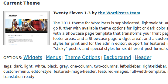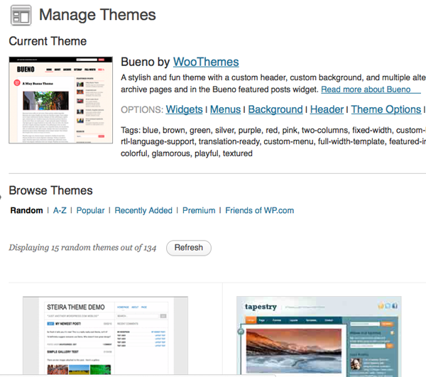 You will then see your current theme displayed at the top of the page, and underneath it a list of available themes that you can choose from, including the name of each theme and a screen shot.