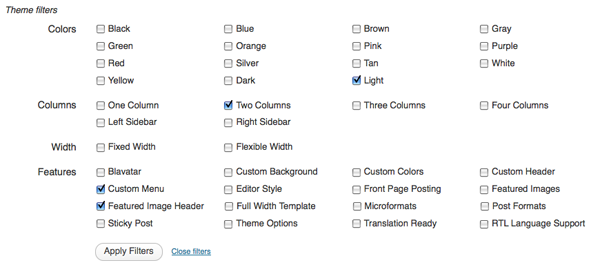 You can filter themes based on certain characteristics; for example, if you wanted to only show themes which have two columns, then you could select that possibility from the grid of options. Click on Feature Filters then use the check boxes to make your selection: