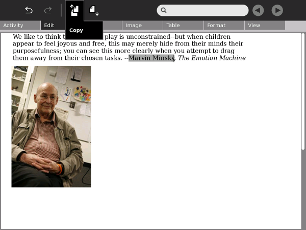 Highlight the text you would like to copy by dragging the cursor across it with the left mouse-button depressed. This example shows the words "Marvin Minsky" highlighted.